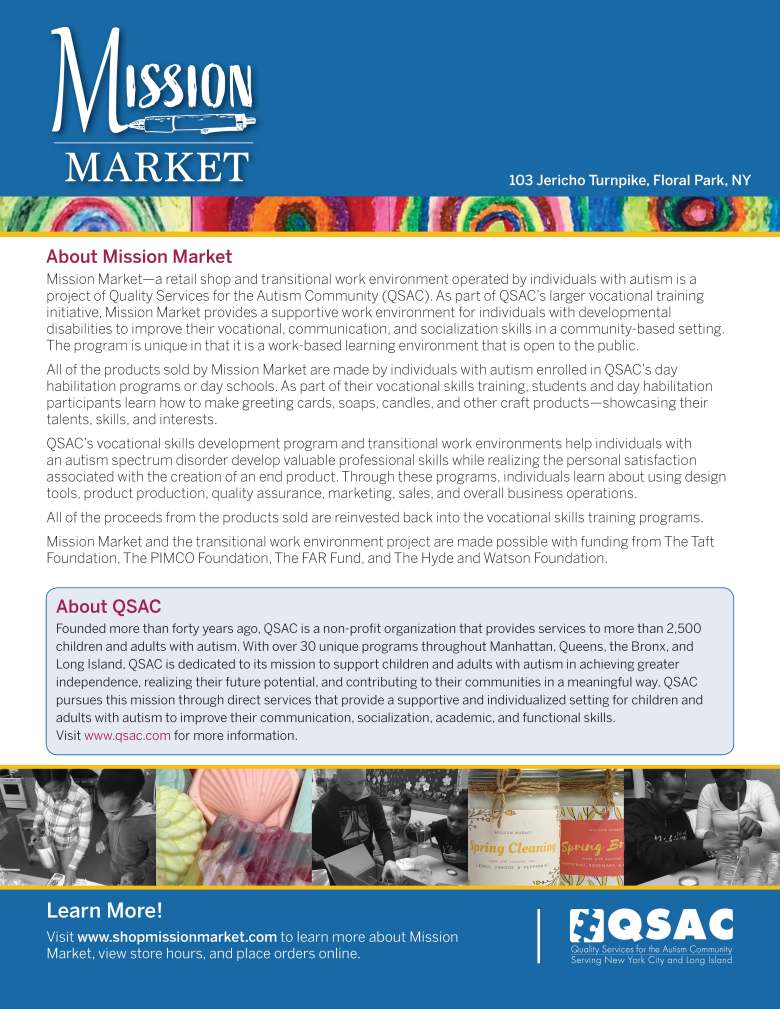 About: In April 2019, QSAC launched a new vocational program and storefront in Queens. I handled all of the branding, including logo design, signage, press releases, and promotion for Mission Market. This is an informational flyer that was distributed to the QSAC community and in-store visitors.